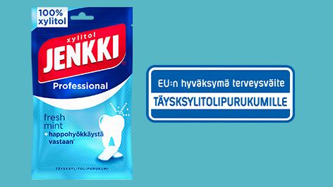 EU terveysväite täysksylitolipurukumille hyväksytään! Taustalla Jenkki Professional -täyskylitolipurukumilla tehdyt laajat tutkimukset.